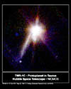 Это инфракрасное изображение новорожденной двойной звезды (центр снимка) показывает длинную тонкую туманность, протянувшуюся к слабому объекту, который, может быть, является первой планетой, вне Солнечной Системы, которая была отображена непосредственно. Яркий объект на изображении - двойная звезда, которая освещает вытянутое облако газа и пыли, из которого звезды и образовались. Звезды окружает такое количество пыли, что они незаметны в видимых лучах. Однако, тепловое (инфракрасное) излучение через пыль проникает. Ниже и слева виднеется слабая точка. Теоретические вычисления
