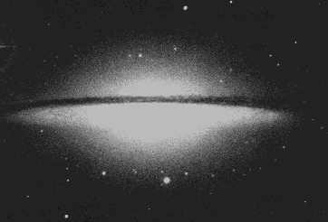 Галактика Сомбреро - спиральная галактика с характерным слоем темной пыли, скрыыающим от нас ядро звездной системы. M104 наклонена лишь на 6╟ от линии идущей вдоль луча зрения. Центральная часть галактики хорошо заметна (сильно выступает) - M104 похожа на элиптическую галактику со спиральными рукавами. |